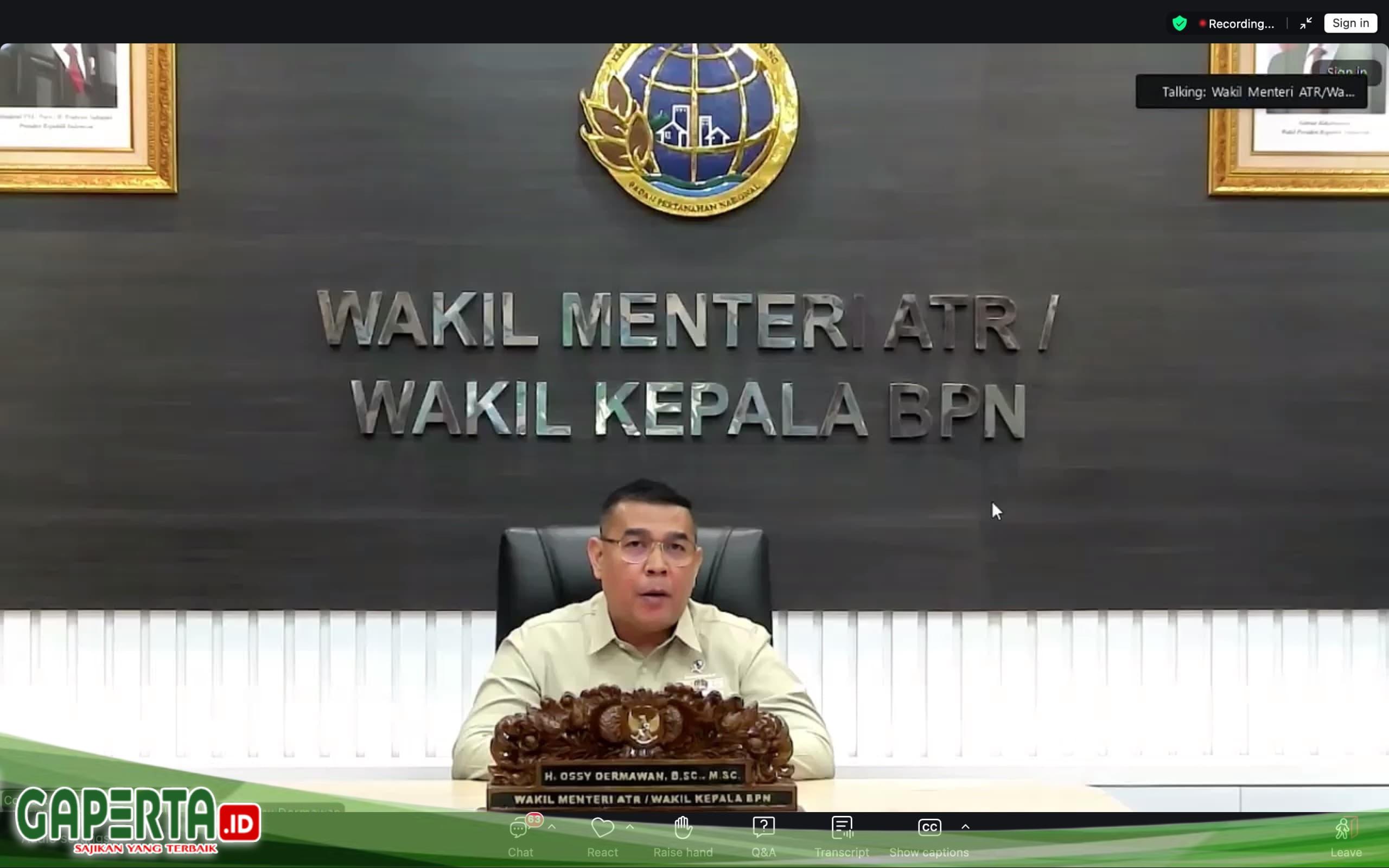 JAKARTA, [Gaperta.id] – Wakil Menteri Agraria dan Tata Ruang/Wakil Kepala Badan Pertanahan Nasional (Wamen ATR/Waka BPN), Ossy Dermawan, menjadi narasumber dalam Webinar Nasional Masyarakat Profesi Penilai Indonesia (MAPPI) pada Senin (23/02/2026). Ia menilai MAPPI memegang peranan penting sebagai penjaga integritas sistem penilaian tanah nasional.